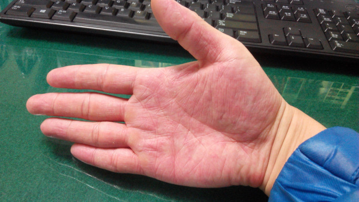 有些人手掌一看红扑扑的,还以为是气血好,其实不一定。肝功能异常时,手掌尤其是大鱼际部位,会出现蜘蛛状的红斑,这叫“肝掌”。